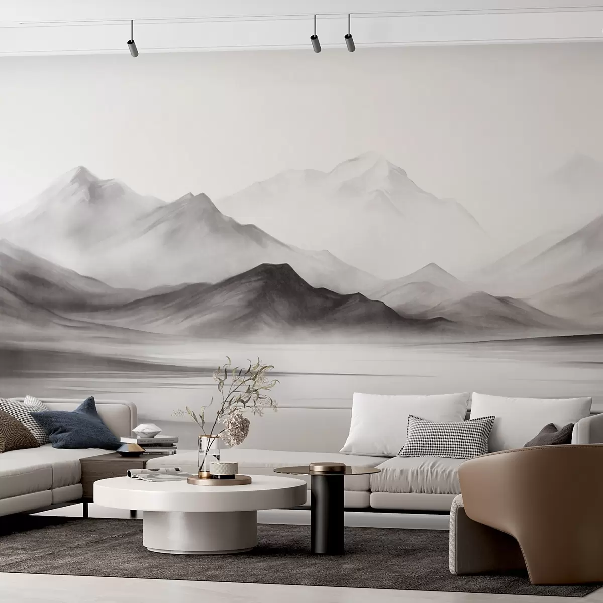 Fototapeten Eine monochrome, strukturierte Landschaft mit nebligen Bergen und einem See im Vordergrund N° w09555