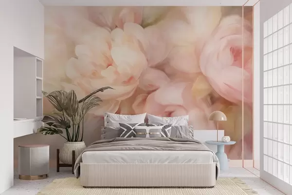 Fototapeten Verschwommene blassrosa und cremefarbene Pfingstrosen mit weichen, malerischen Pinselstrichen, die ein strukturiertes Blumenarrangement schaffen N° w09556