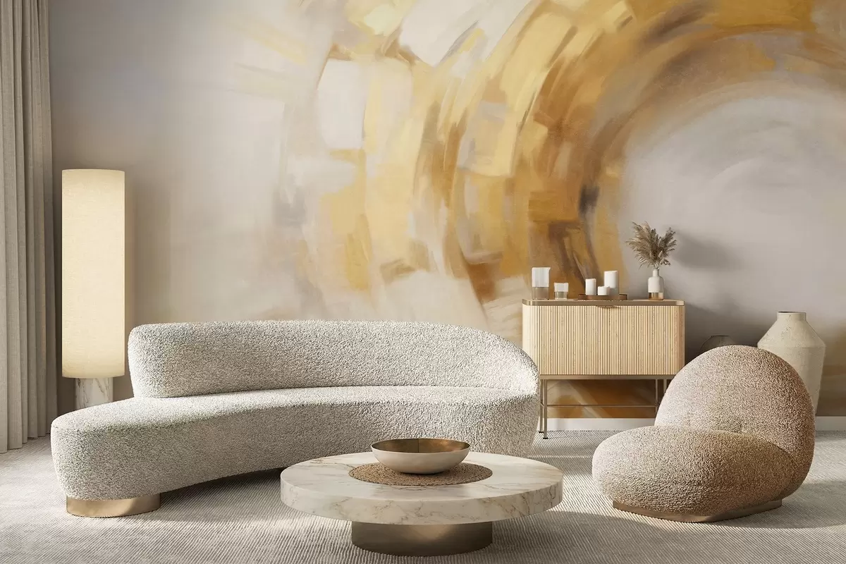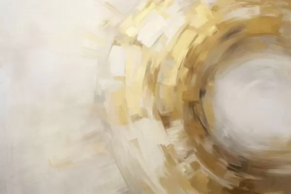 Fototapeten Abstrakte Malerei-Imitation mit kreisförmigen, strukturierten Pinselstrichen in Gelb und Weiß, die ein Gefühl von Bewegung erzeugen. N° w09558
