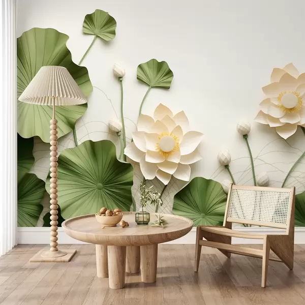 Fototapeten 3D-Lotusblumen mit grünen, strukturierten Blättern, minimalistischer Stil N° w09560