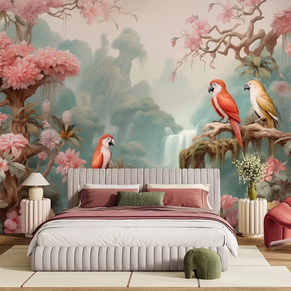 Fototapeten Ein märchenhafter tropischer Wald mit Papageien, blühenden Bäumen mit rosa Blüten und einem Wasserfall N° w09580