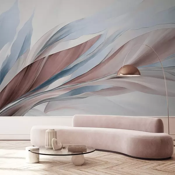 Fototapeten Abstrakte, fließende Wellen in Blau und Braun mit dünnen Formen und Linien vor weißem Hintergrund, strukturierte Kunst N° w09585v1