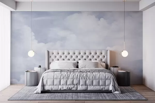 Fototapeten Pastellfarbener, strukturierter Himmel voller weißer Wolken mit sanfter und minimalistischer Ästhetik N° w09589