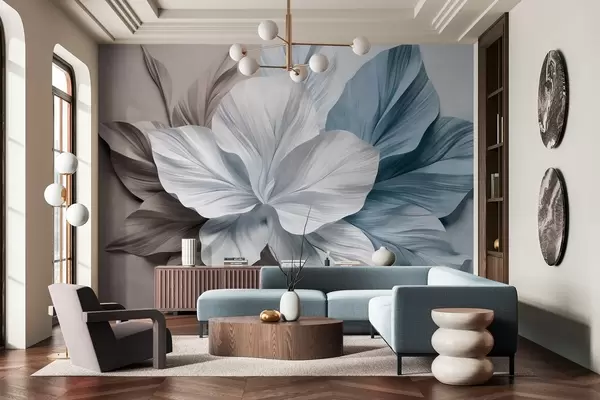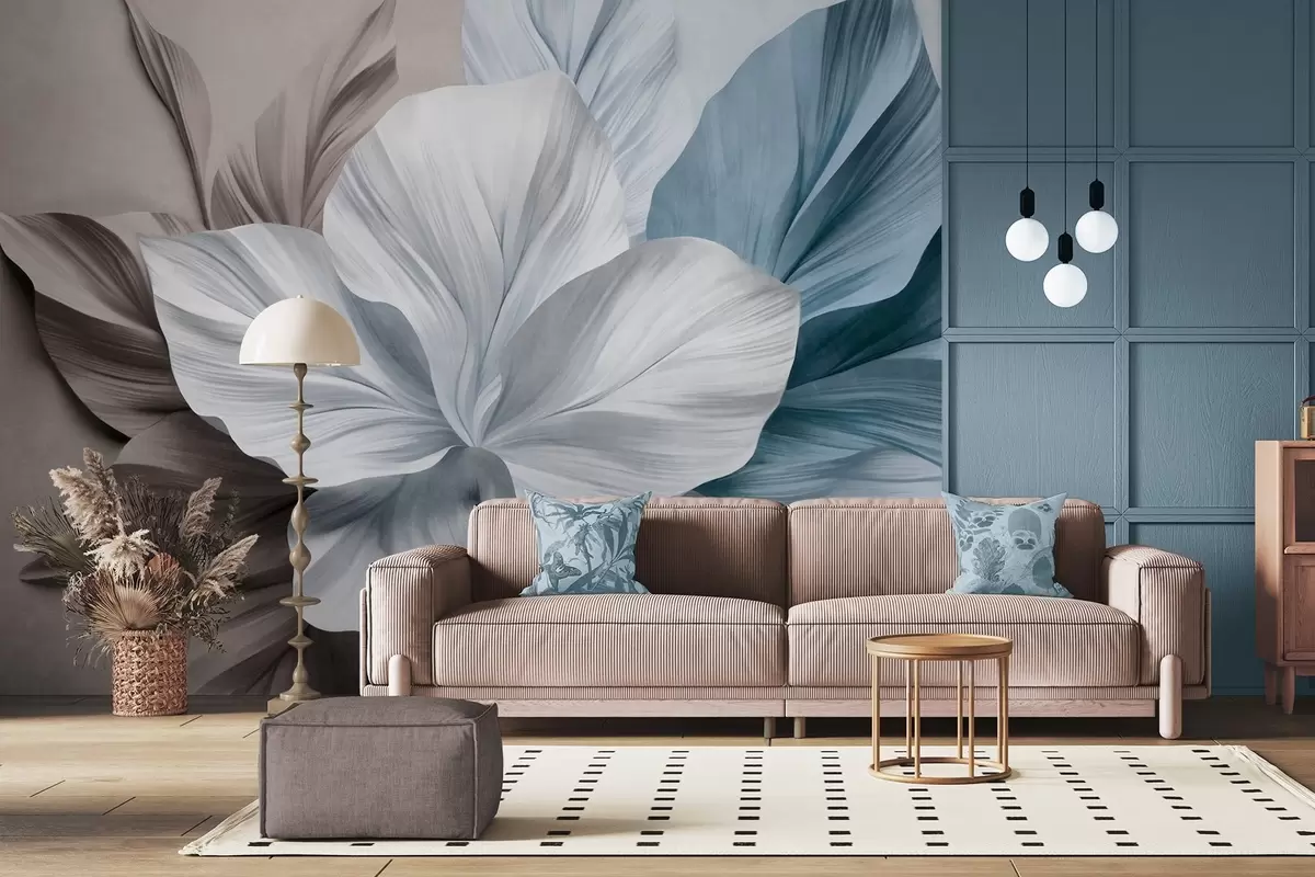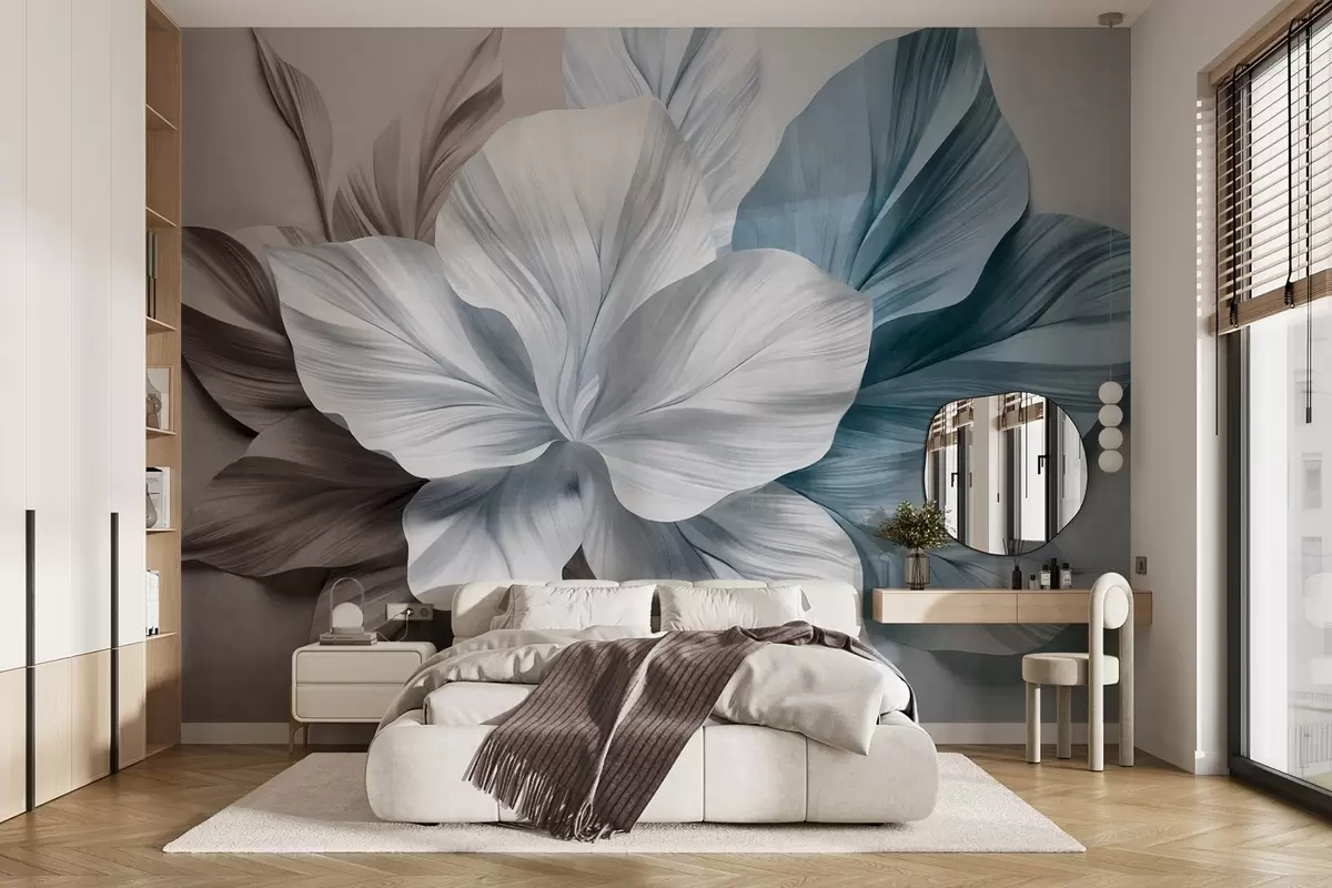 Fototapeten Abstrakte Blume mit mehreren Blütenblättern und strukturierten Blättern in Braun- und Blautönen, weicher Hintergrund N° w09604v1