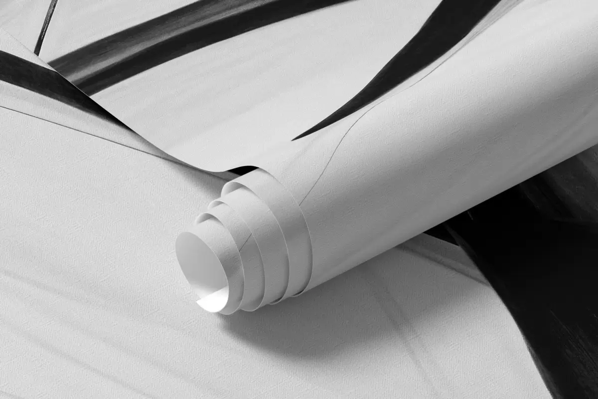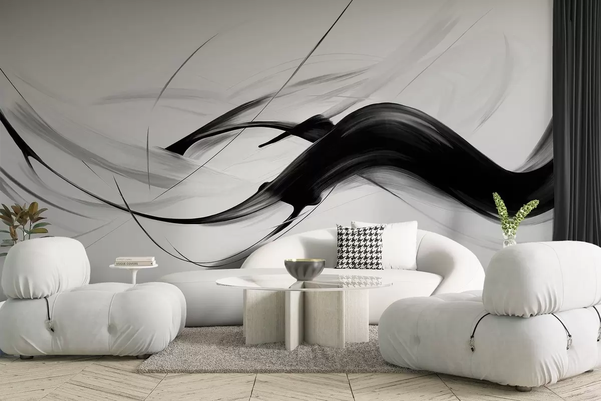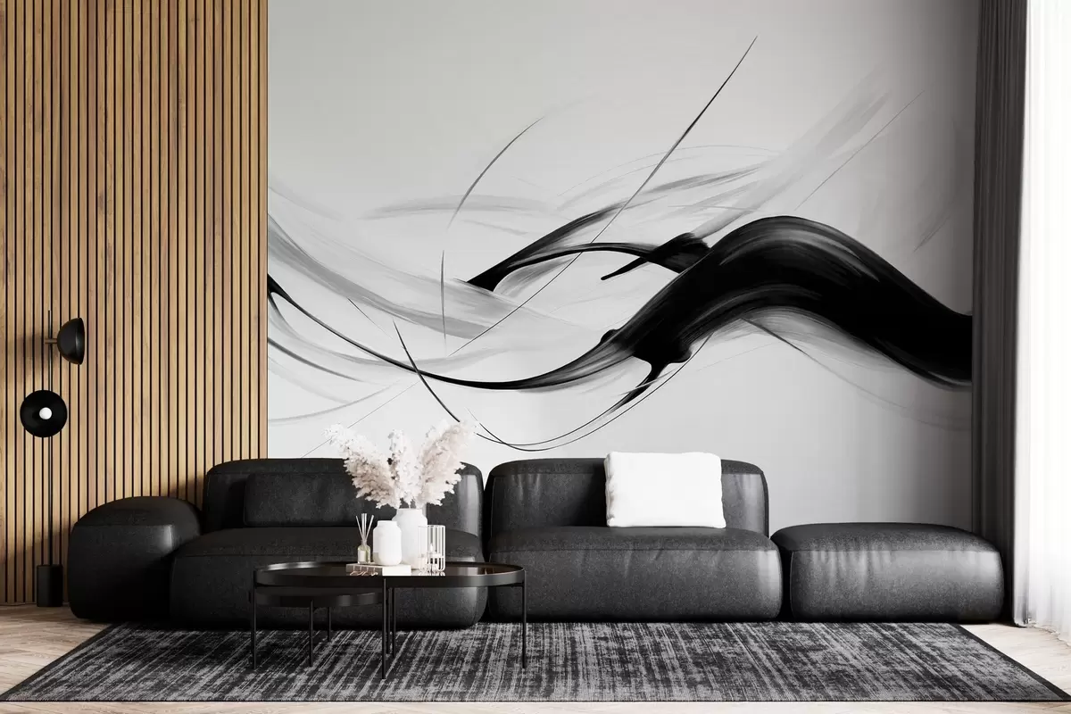 Fototapeten Abstrakte Schwarz-Weiß-Pinselstriche mit dünnen Linien, die ein modernes Design vor hellem Hintergrund bilden. N° w09605