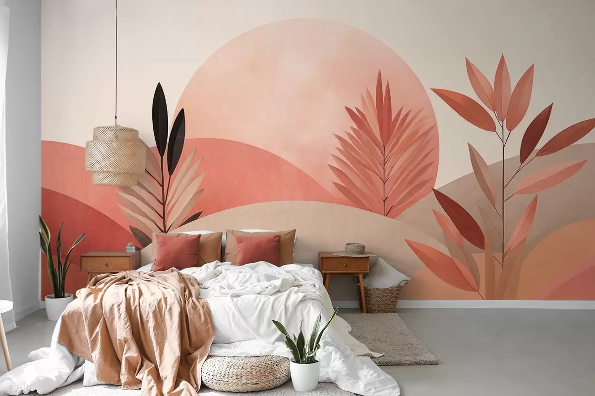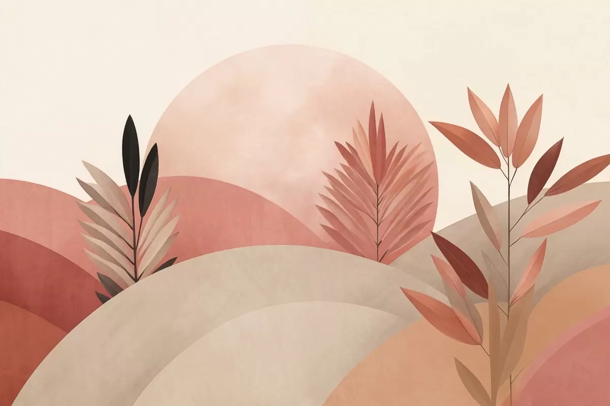 Fototapeten Abstrakte Boho-Landschaft, Sonne hinter sanften Hügeln, Pflanzen im Vordergrund, minimalistisch, strukturiert, gedeckte Farben N° w09608