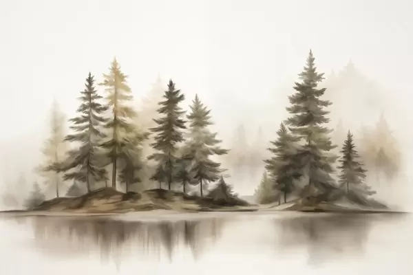Fototapeten Ein strukturierter, nebliger Wald mit hohen Kiefern, gemalt in Imitationstechnik N° w09610