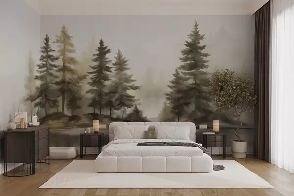 Fototapeten Ein strukturierter, nebliger Wald mit hohen Kiefern, gemalt in Imitationstechnik N° w09610