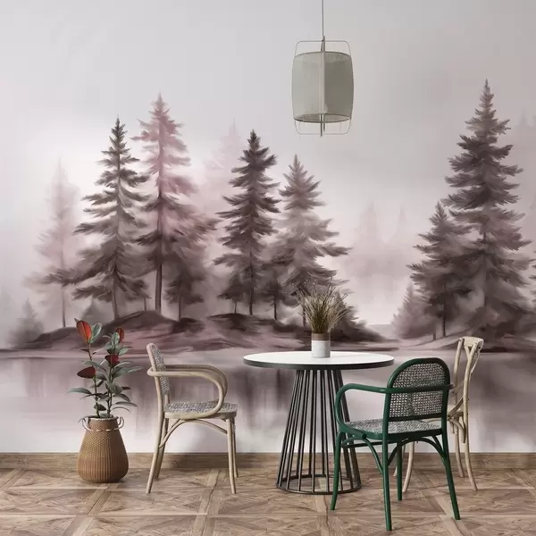 Fototapeten Ein strukturierter, nebliger Wald mit hohen Kiefern, gemalt in Imitationstechnik N° w09610v1