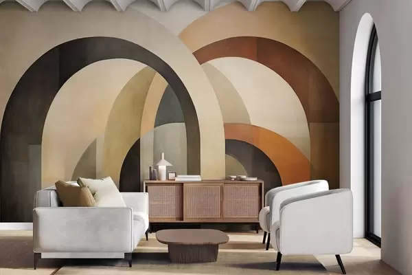 Fototapeten Abstrakte, strukturierte geometrische Bögen in erdigen Beige-, Braun- und Grautönen, ein vielschichtiges modernes architektonisches Design N° w09611