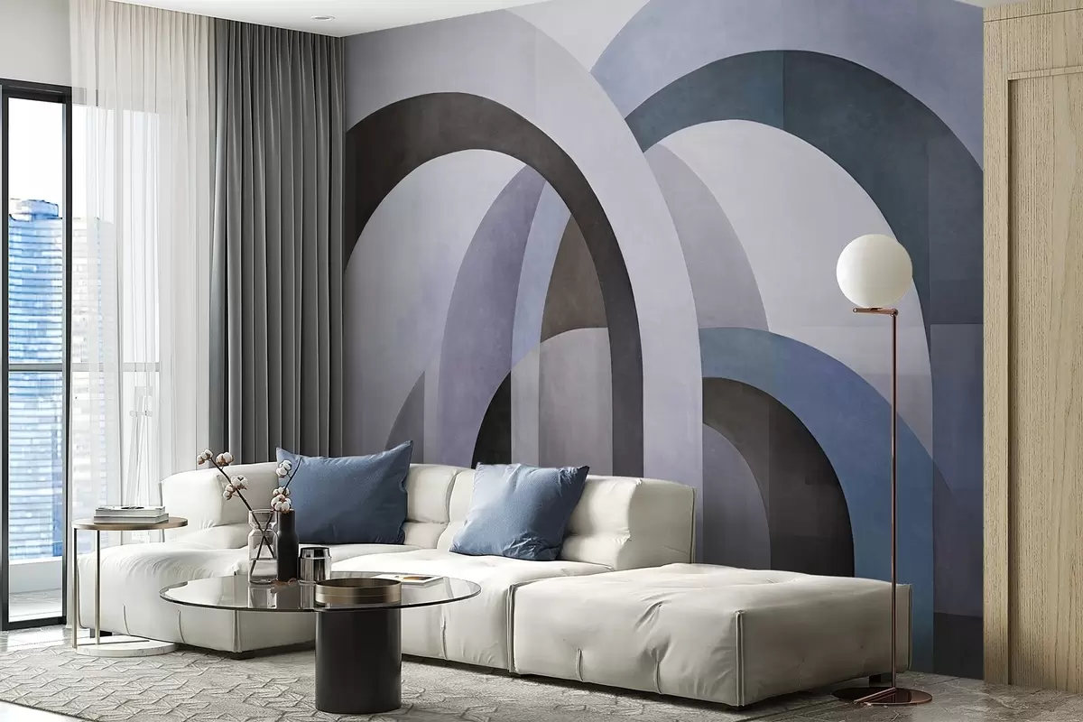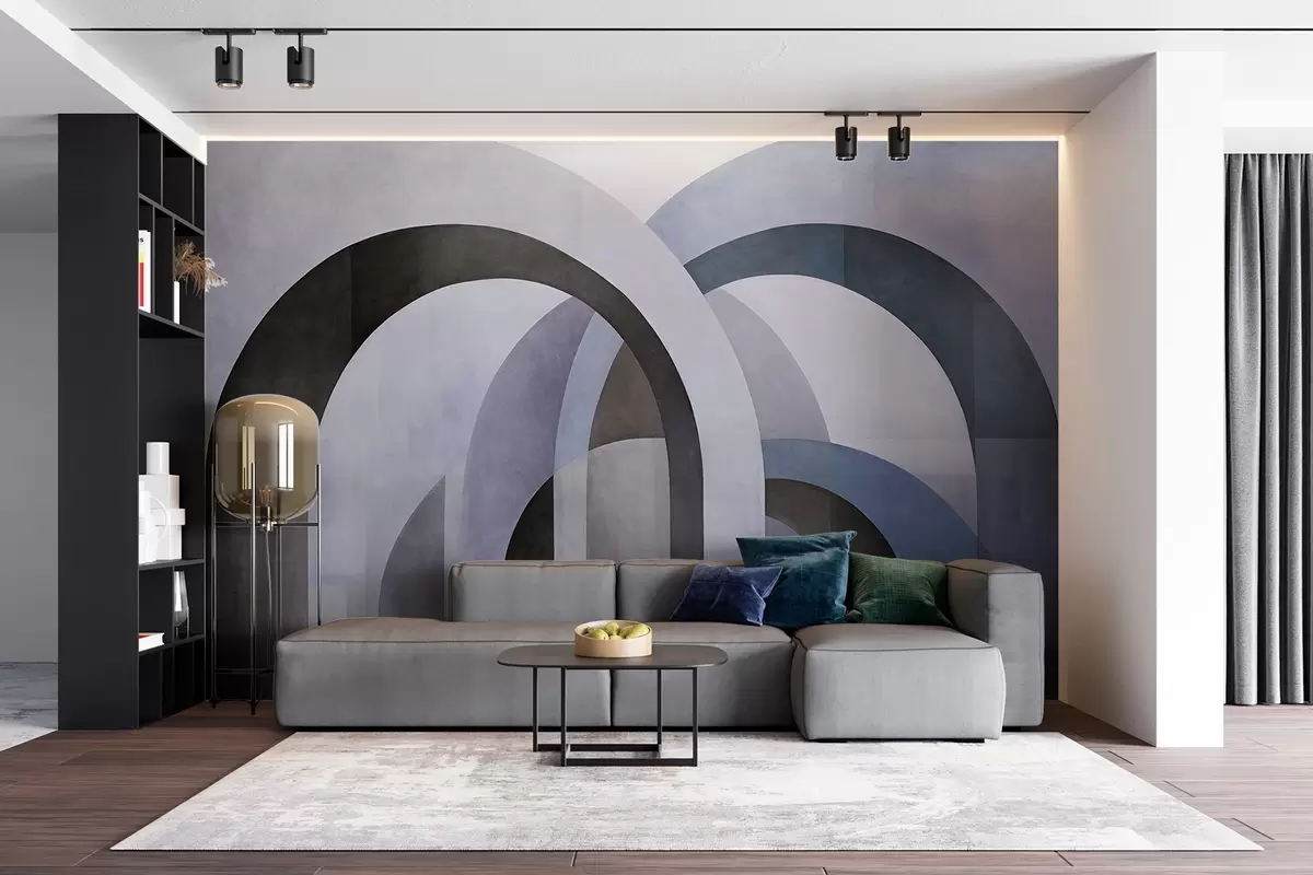 Fototapeten Abstrakte, strukturierte geometrische Bögen in Blau-, Schwarz- und Grautönen, ein vielschichtiges modernes architektonisches Design N° w09611v1