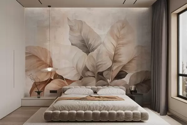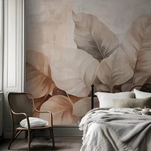 Fototapeten Strukturierte Malerei, die große, hellbraune Blätter vor einem neutralen Hintergrund mit subtilen Pinselstrichen imitiert. N° w09614