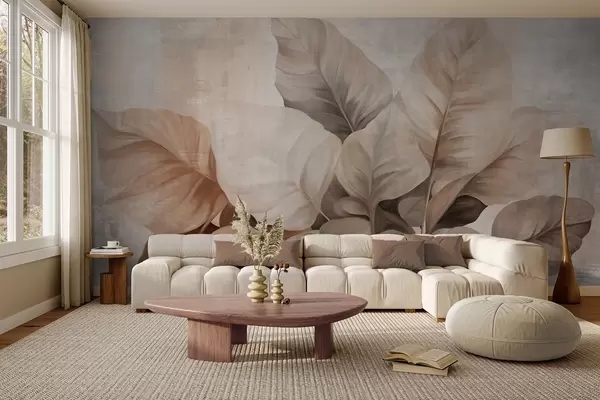 Fototapeten Strukturierte Malerei, die große, hellbraune Blätter vor einem neutralen Hintergrund mit subtilen Pinselstrichen imitiert. N° w09614