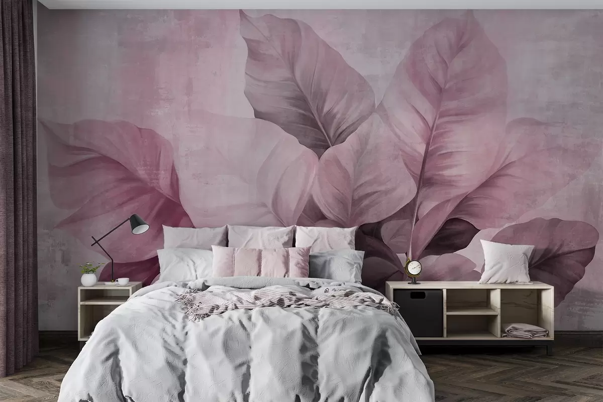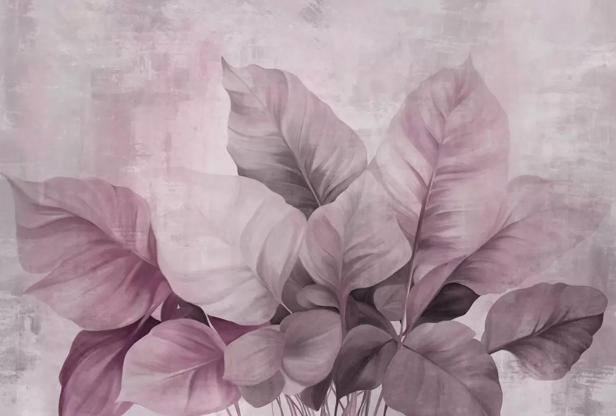 Fototapeten Strukturierte Malerei, die große, hellrosa Blätter vor einem neutralen Hintergrund mit subtilen Pinselstrichen imitiert. N° w09614v1