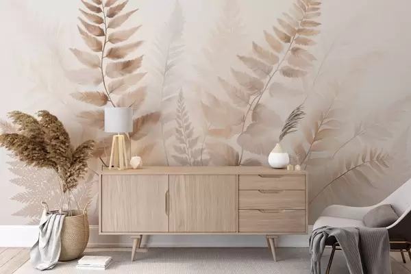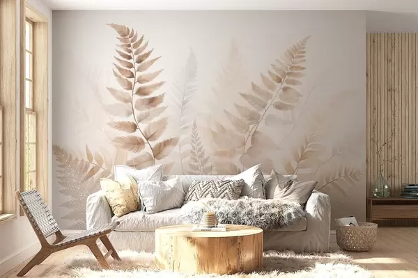 Fototapeten Strukturierte getrocknete Farnwedel in verschiedenen Brauntönen, mit einem weichen, hellen Hintergrund im Aquarellstil N° w09615