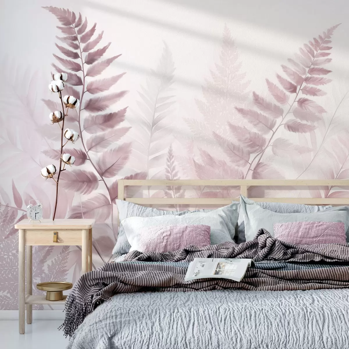 Fototapeten Strukturierte getrocknete Farnwedel in verschiedenen Rosatönen, mit einem weichen, hellen Hintergrund im Aquarellstil N° w09615v2