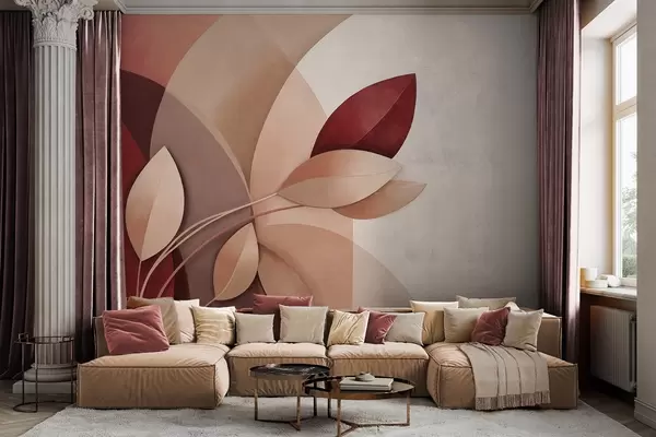 Fototapeten Abstrakter, strukturierter Ast mit Blättern in Braun-, Beige- und Rottönen vor einem Hintergrund aus abstrakten Formen N° w09618
