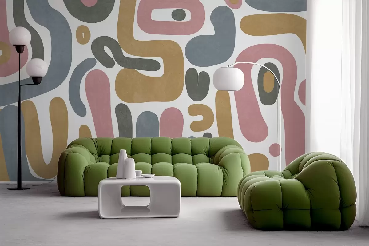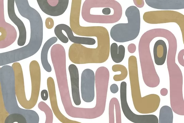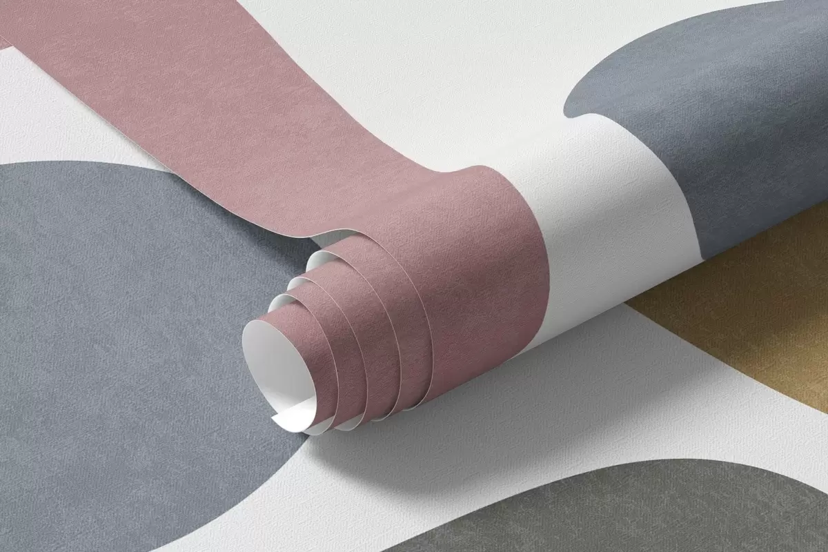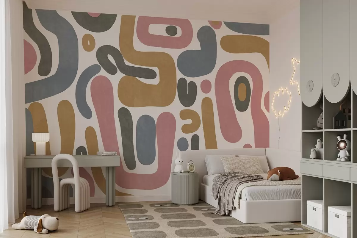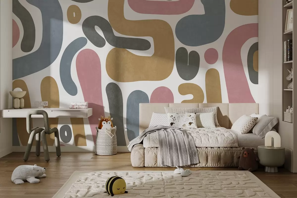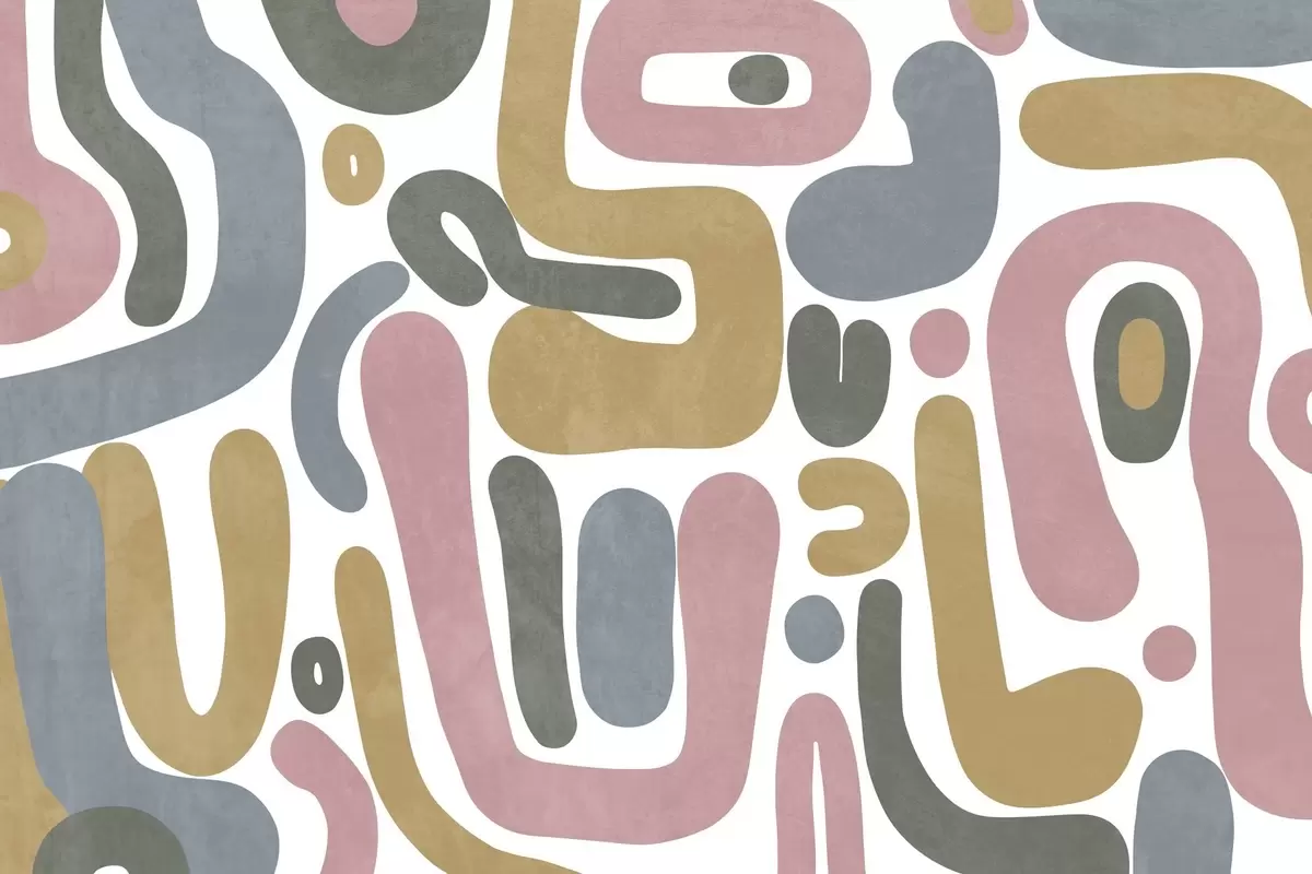 Fototapeten Abstrakte, strukturierte Formen in Pastellrosa, gedecktem Blau, Senfgelb und Grau auf weißem Hintergrund – moderne Kunst N° w09620