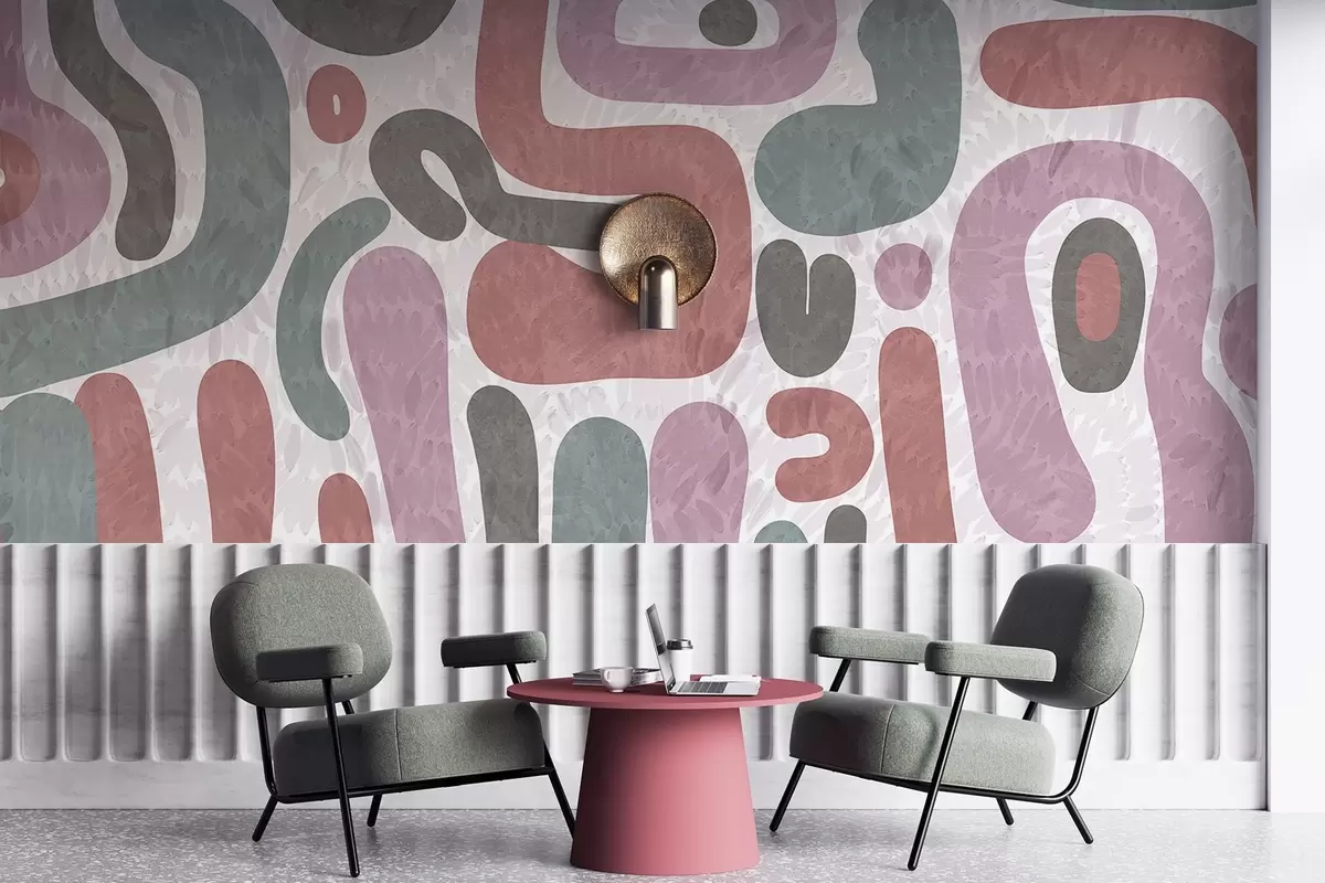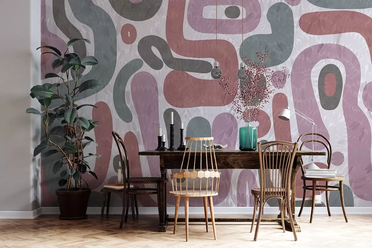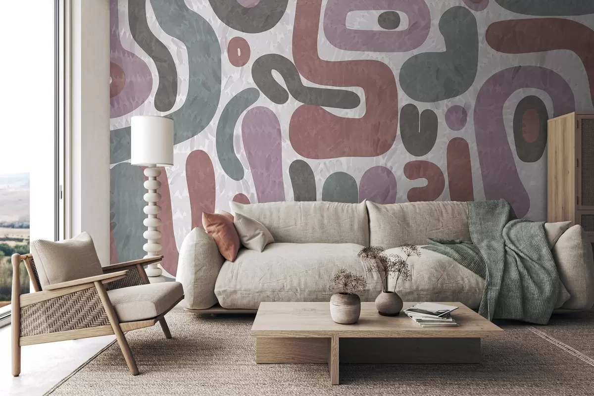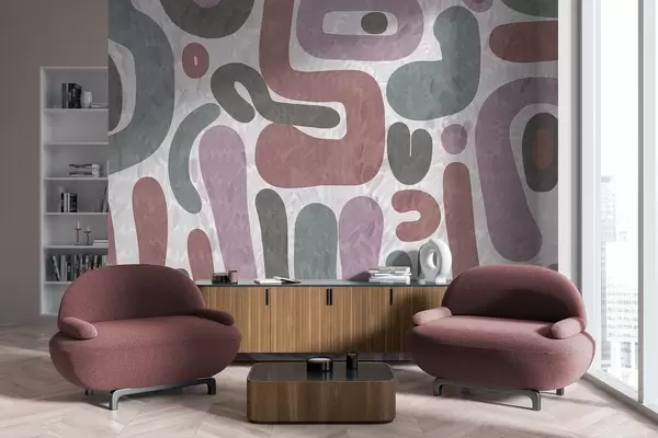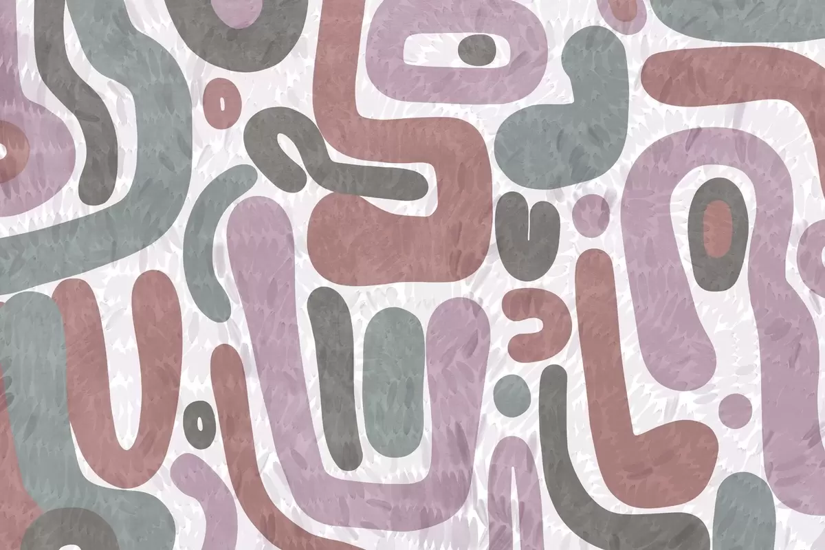 Fototapeten Abstrakte, strukturierte Formen in gedeckten Rosa-, Grün- und Grautönen auf strukturiertem Hintergrund – moderne Kunst N° w09622