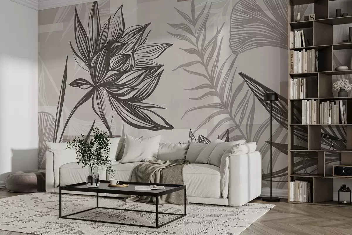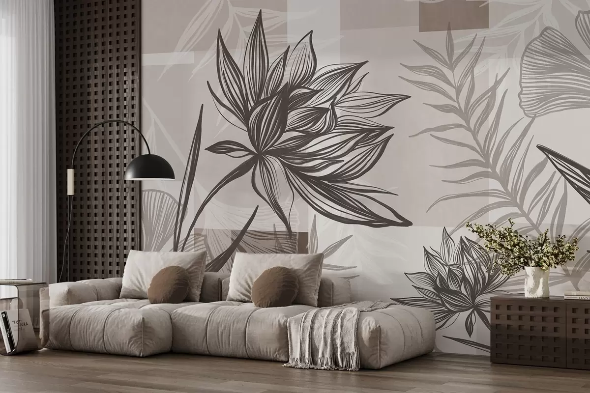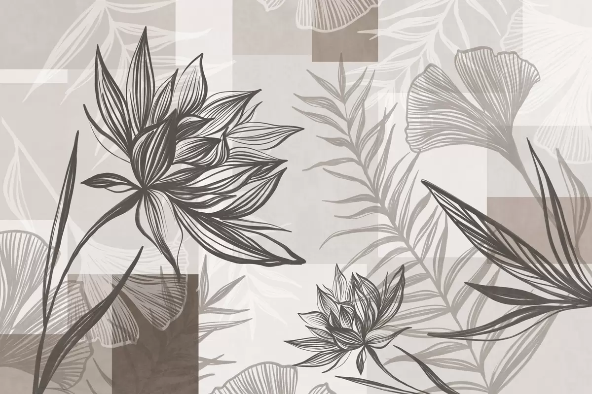 Fototapeten Stilisierte Blumen und Blätter in Braun- und Beigetönen mit geometrischem Hintergrund, Strichzeichnung N° w09629
