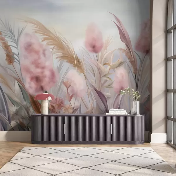 Fototapeten Rosa und beige Pampasgras und andere Trockenblumen vor einem sanften, dunstigen Himmel N° w09635