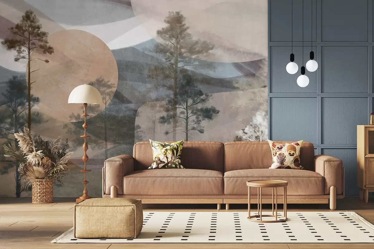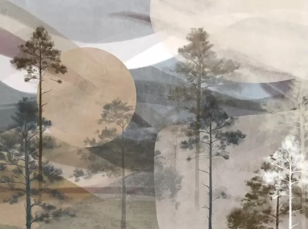Fototapeten Hohe Kiefern in einer gedämpften, strukturierten Landschaft mit abstrakten kreisförmigen Formen und geschichteten Bergen in Erdtönen N° w09636