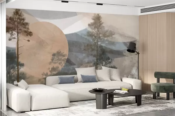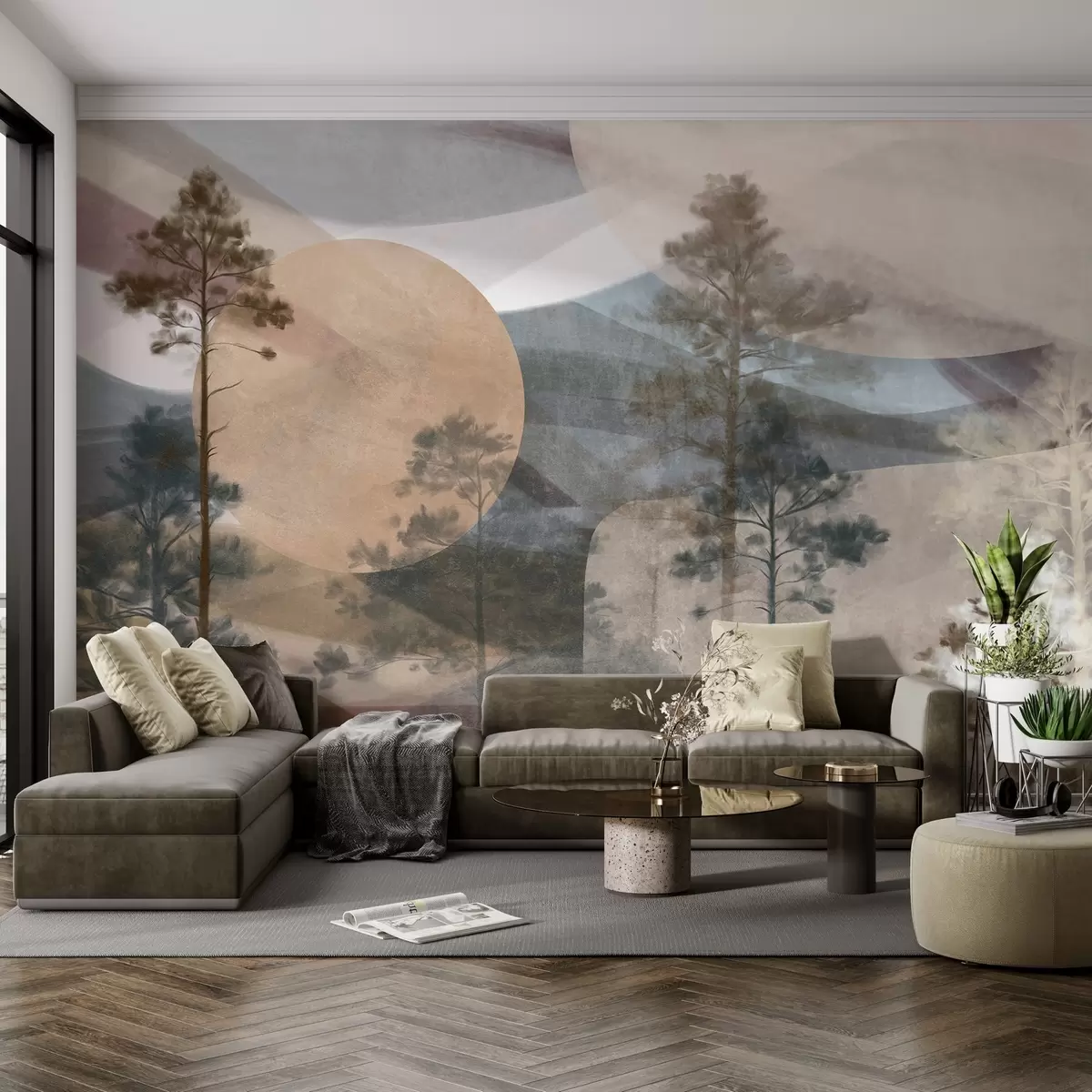 Fototapeten Hohe Kiefern in einer gedämpften, strukturierten Landschaft mit abstrakten kreisförmigen Formen und geschichteten Bergen in Erdtönen N° w09636