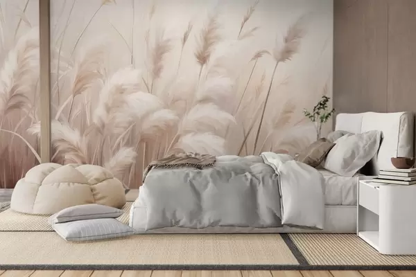 Fototapeten Hohes, strukturiertes Pampasgras in sanften, warmen, neutralen Farbtönen, mit einem verschwommenen, hellen Hintergrund N° w09637
