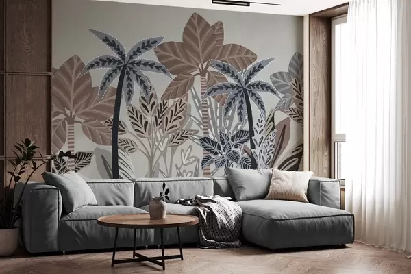 Fototapeten Strukturierte tropische Pflanzen und Palmen in gedeckten Farben im dekorativen Boho-Stil vor grauem Hintergrund N° w09639v1