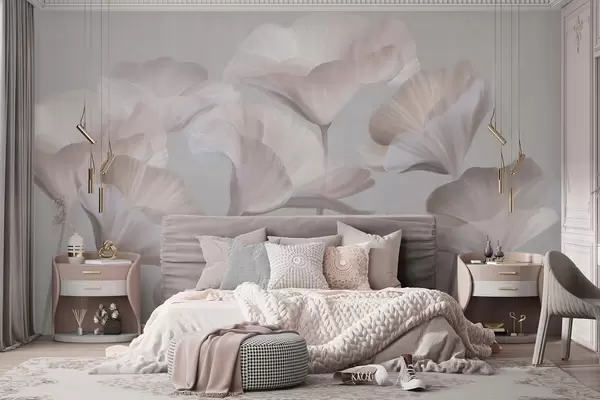 Fototapeten Blasspfirsichfarbene, strukturierte, durchscheinende Lotusblüten mit zarten Blütenblättern vor einem gedämpften grauen Hintergrund N° w09640