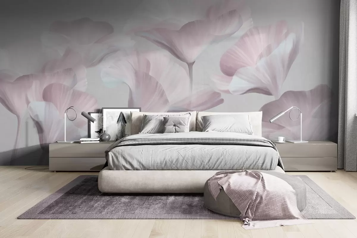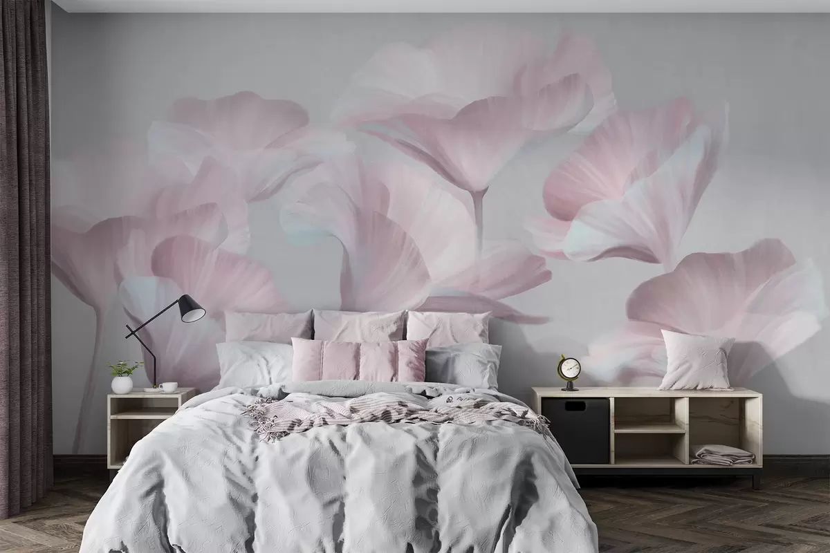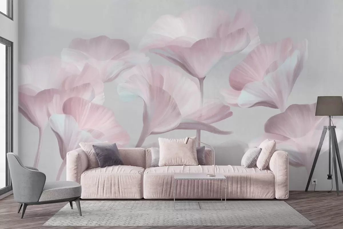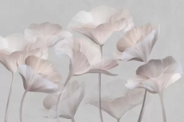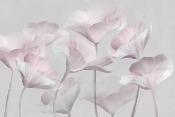 Fototapeten Zartrosa strukturierte, durchscheinende Lotusblüten mit zarten Blütenblättern vor einem gedämpften grauen Hintergrund N° w09640v1