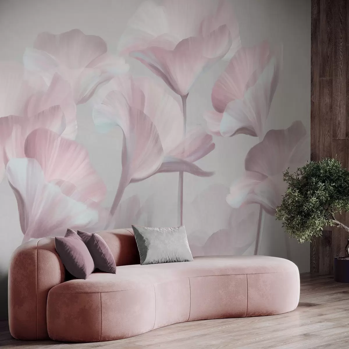 Fototapeten Zartrosa strukturierte, durchscheinende Lotusblüten mit zarten Blütenblättern vor einem gedämpften grauen Hintergrund N° w09640v1