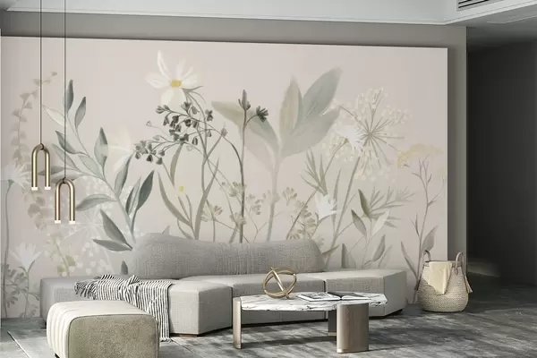 Fototapeten Zarte Wildblumen und Blätter in gedeckten Grün- und Cremetönen vor einem sanften beigen Hintergrund N° w09641