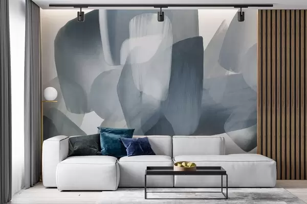 Fototapeten Abstrakte, strukturierte Formen in gedeckten Blau- und Grautönen, mit weichen Kanten und überlappenden Schichten N° w09642v1