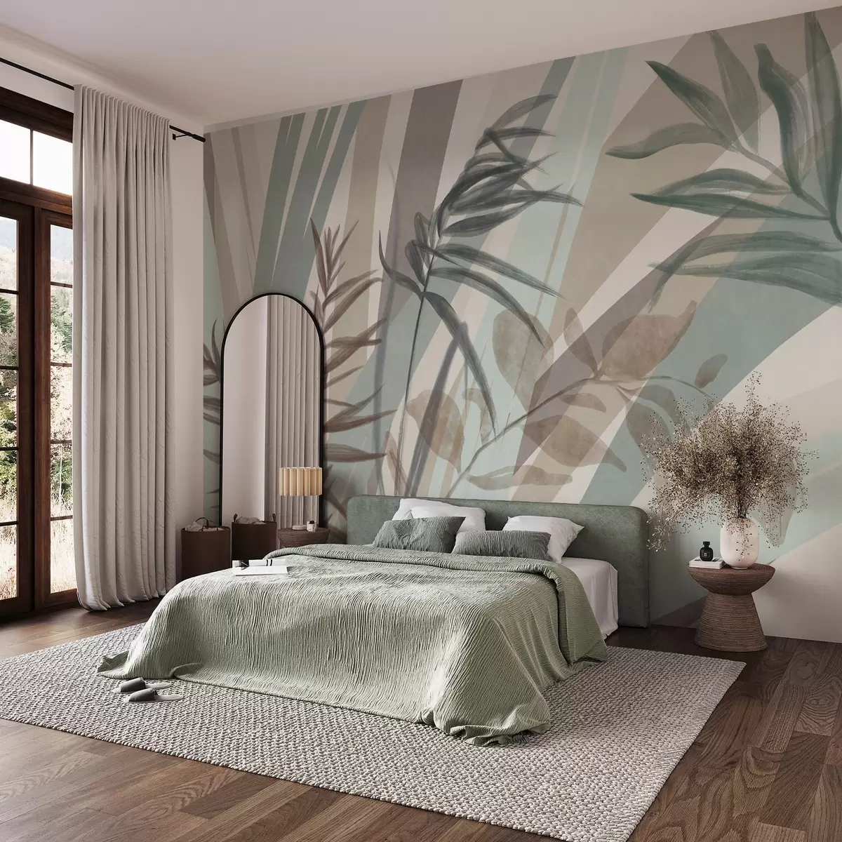Fototapeten Hohes, strukturiertes Gras und Blätter in gedeckten Erdtönen, mit abstrakten Linien im Hintergrund, die einen organischen Druck ergeben. N° w09643