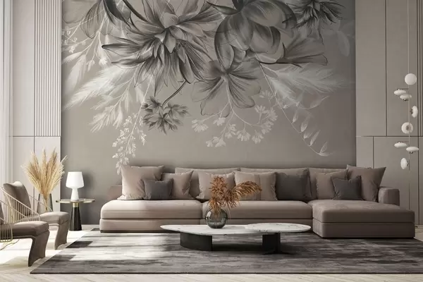 Fototapeten Strukturierte Blumen und Farne in Dunkelgrau- und Weißtönen vor einem gedeckten beigen Hintergrund im Zeichenstil N° w09644