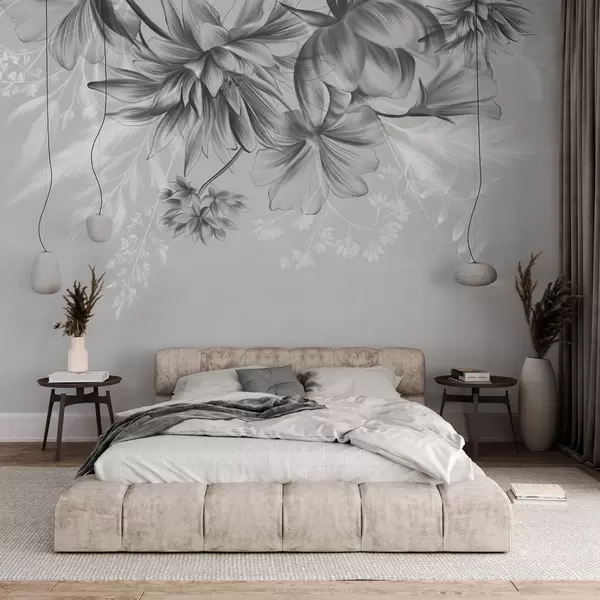 Fototapeten Strukturierte Blumen und Farne in Dunkelgrau- und Weißtönen vor einem gedeckten grauen Hintergrund im Zeichenstil N° w09644v1