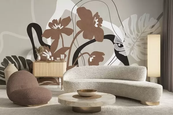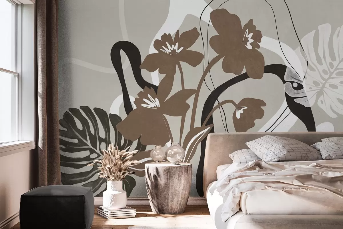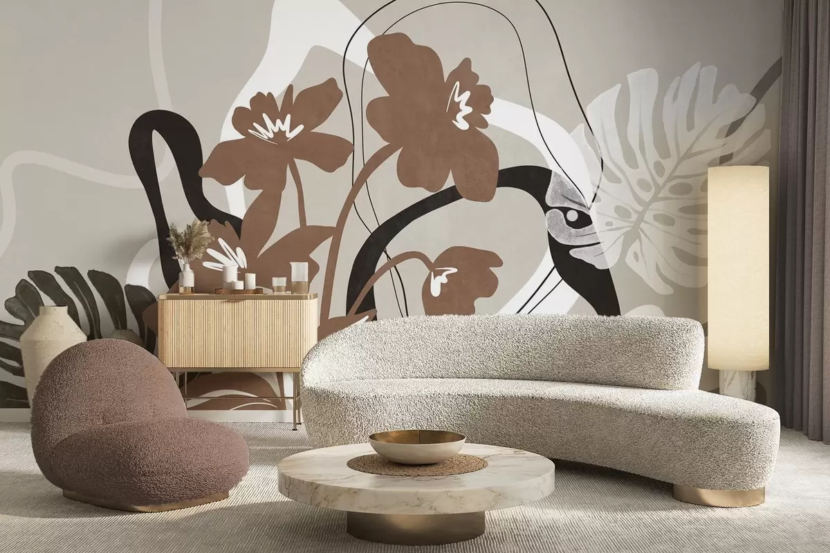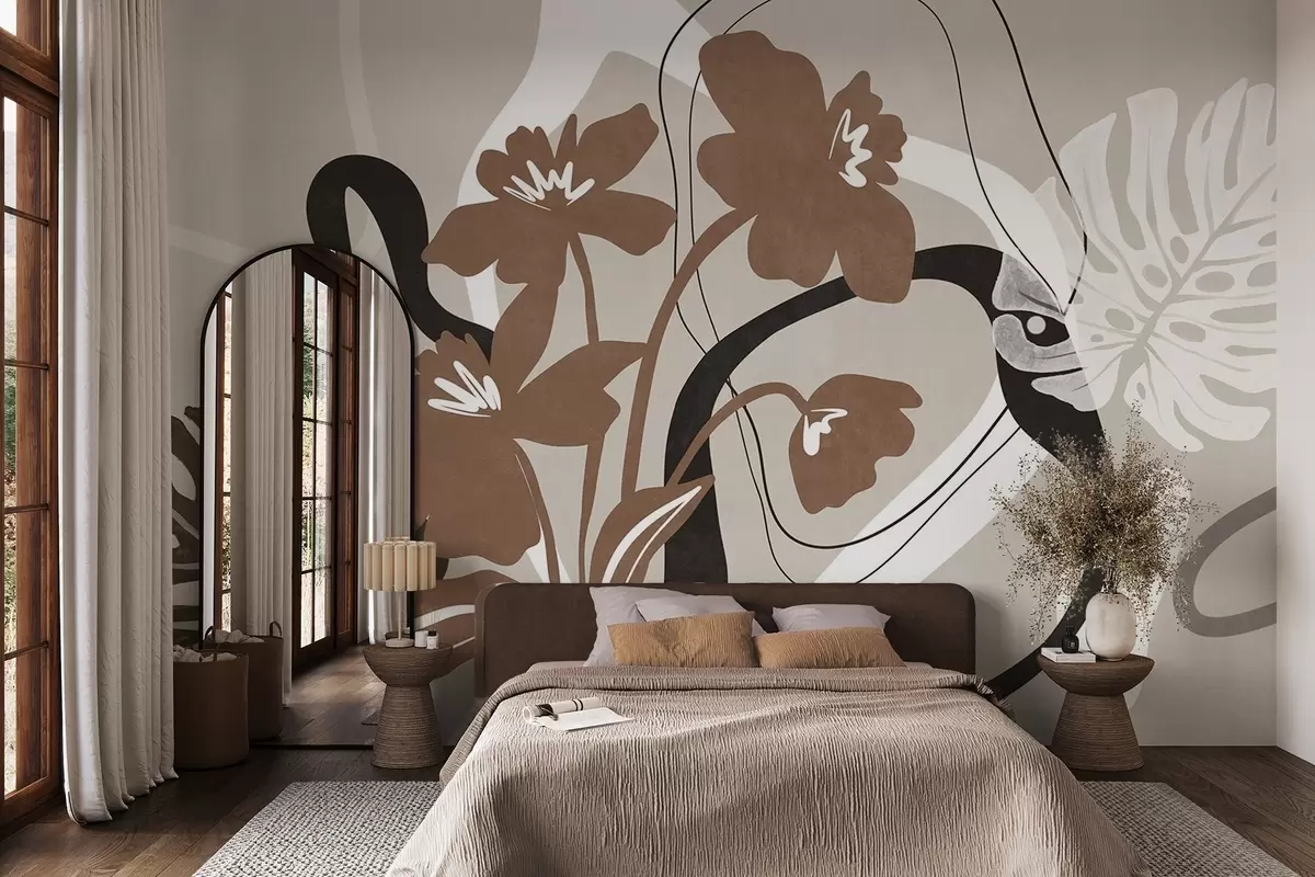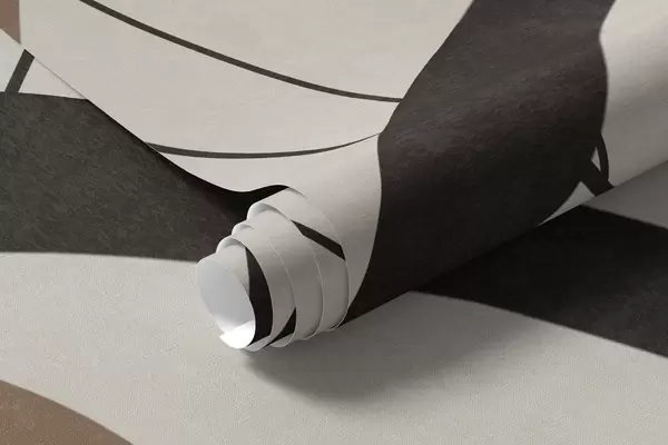 Fototapeten Abstrakte, strukturierte braune Blumen mit weißen und schwarzen Formen vor beigem Hintergrund, minimalistische Kunst N° w09645v1