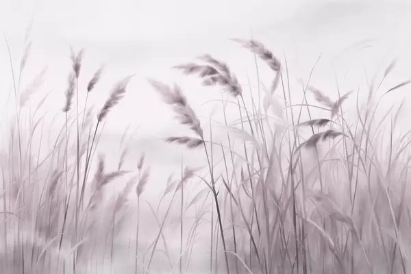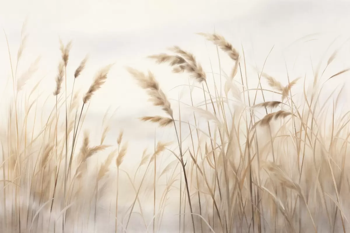 Fototapeten Hohes, strukturiertes trockenes Gras mit Weizenähren auf einem Feld vor einem weichen, blassen Hintergrund N° w09648