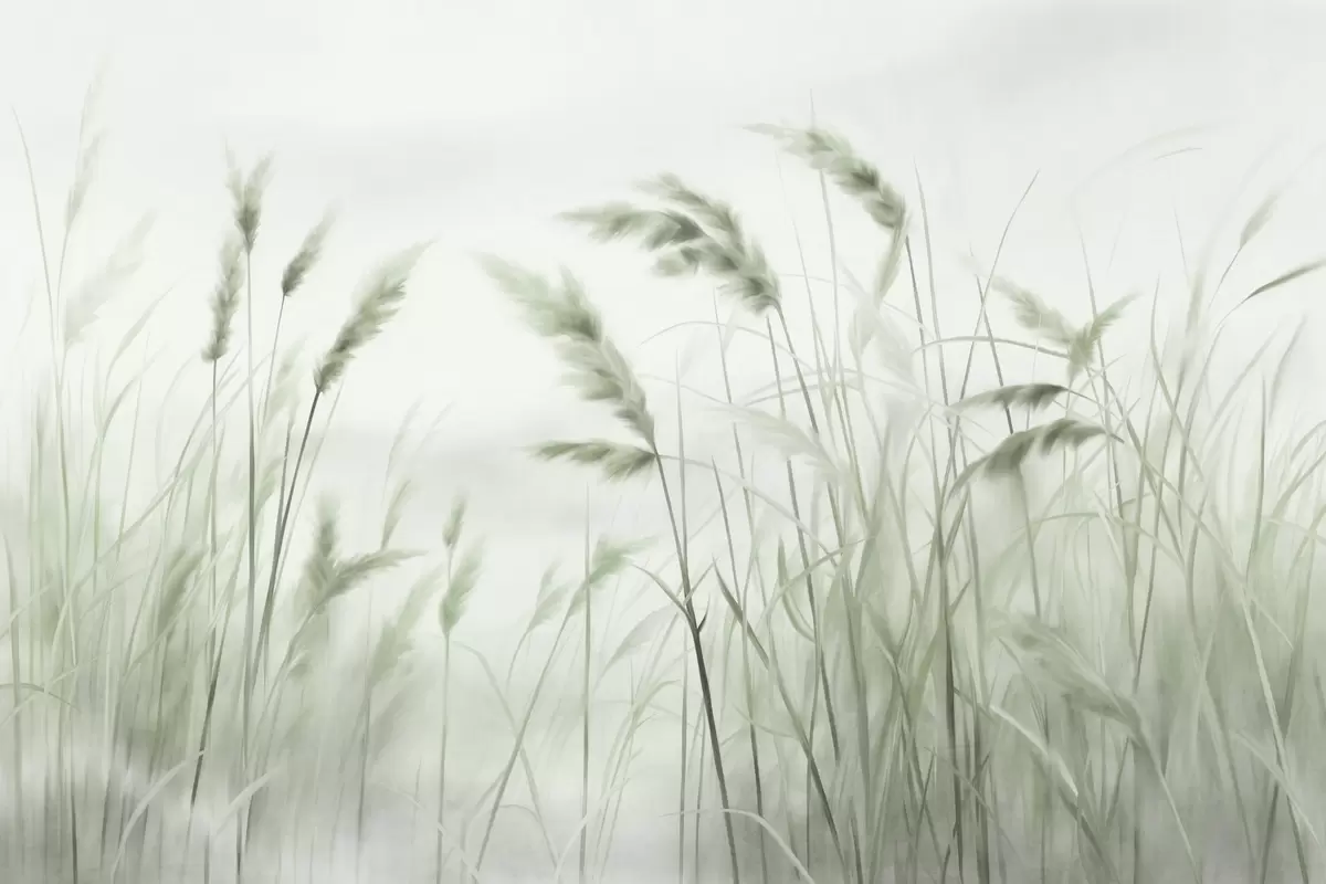 Fototapeten Hohes, strukturiertes trockenes Gras mit Weizenähren auf einem Feld vor einem weichen, blassen Hintergrund N° w09648v1