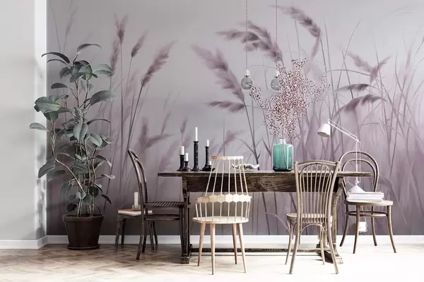 Fototapeten Hohes, strukturiertes trockenes Gras mit Weizenähren auf einem Feld vor einem weichen, blassen Hintergrund N° w09648v2