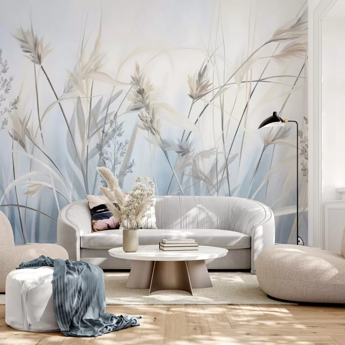 Fototapeten Hohe, trockene Grashalme mit federartigen Spitzen in gedeckten Farbtönen, weicher, verschwommener blauer und weißer Hintergrund N° w09652
