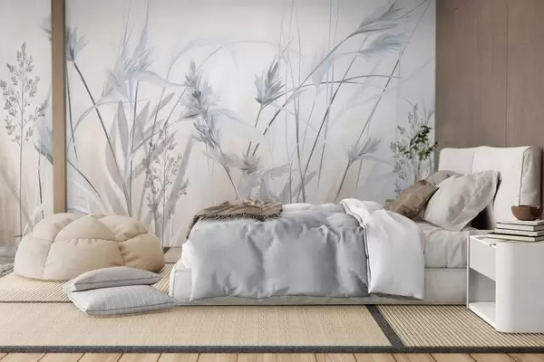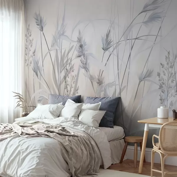 Fototapeten Hohe, trockene Grashalme mit federartigen Spitzen in gedeckten Farbtönen, weicher, verschwommener weißer und beiger Hintergrund N° w09652v1