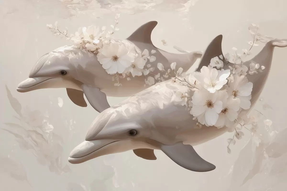 Fototapeten Delfine in einem Meer aus zarten Blumen und sanftem Licht N° w09666
