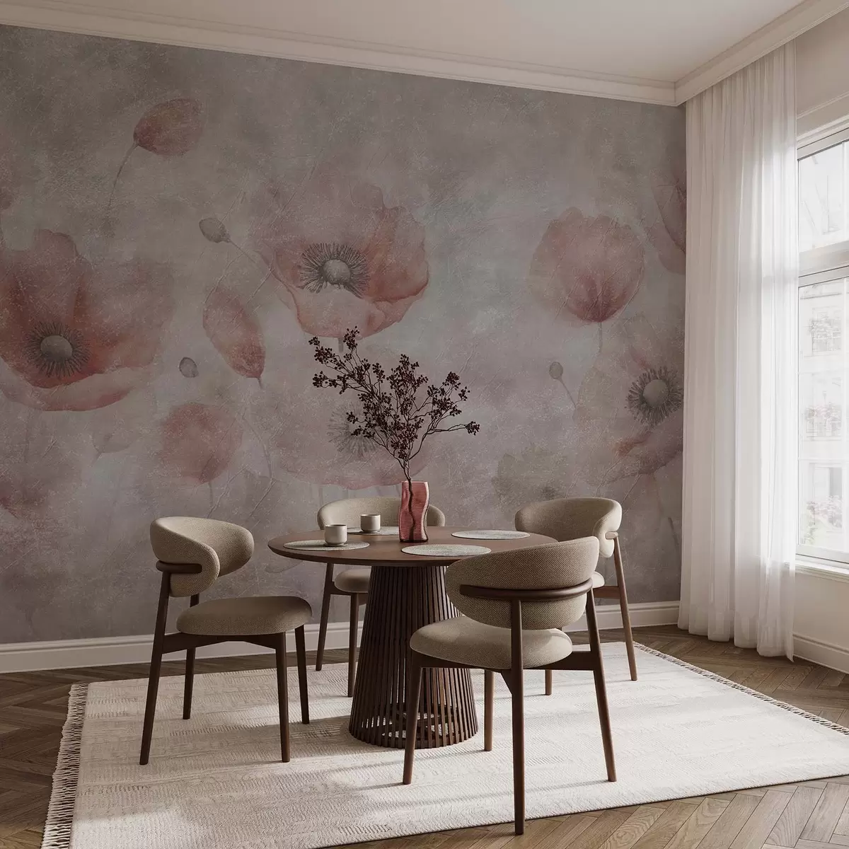 Fototapeten Große Mohnblumen auf einer Wand mit Antik-Effekt N° w09686