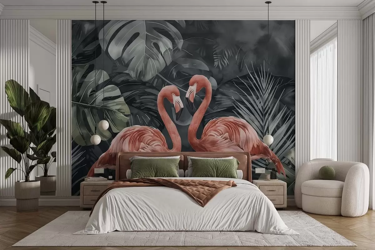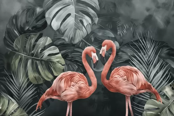 Fototapeten Ein Paar Flamingos in tropischen Pflanzen N° w09687
