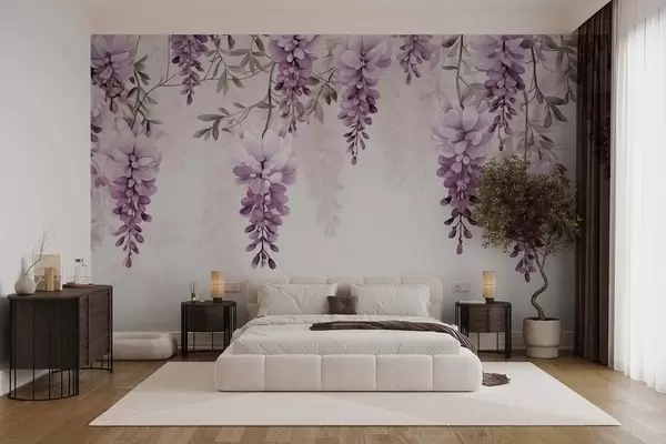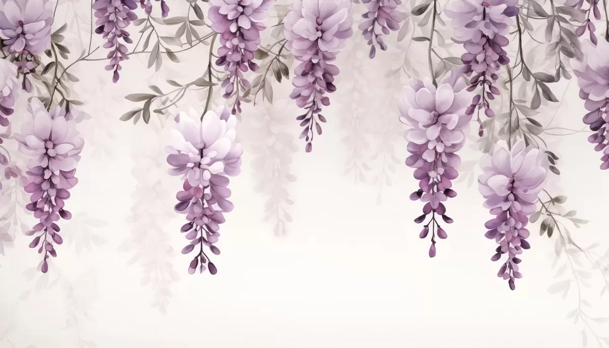 Fototapeten Zarte, große Lavendelzweige, die an der Wand hängen, imitierte Aquarellmalerei N° w09690