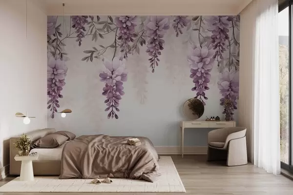 Fototapeten Zarte, große Lavendelzweige, die an der Wand hängen, imitierte Aquarellmalerei N° w09690