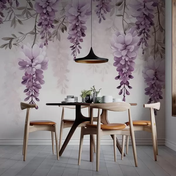 Fototapeten Zarte, große Lavendelzweige, die an der Wand hängen, imitierte Aquarellmalerei N° w09690