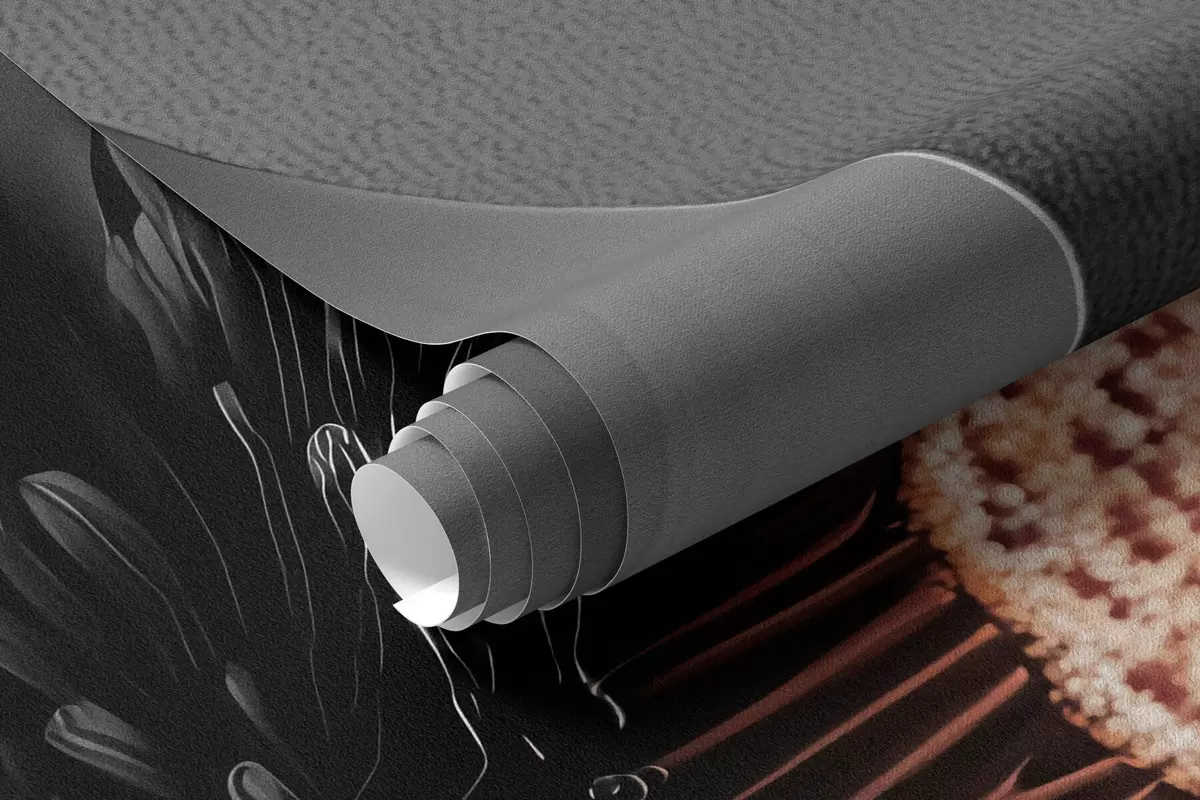 Fototapeten Minimalistische schwarze Blume mit Blütenblättern und einem kontrastierenden, warmen Blütenkern N° w09721